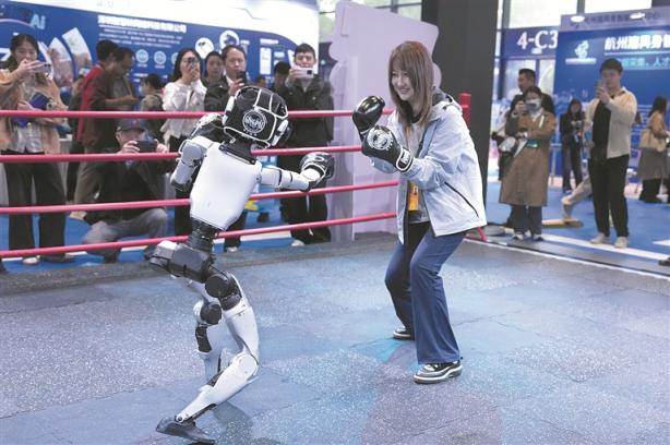 11月6日,2025年世界互联网大会“互联网之光”博览会在浙江乌镇开幕。图为观众在博览会现场体验与宇树科技G1机器人“格斗”。 新华社记者 黄宗治 摄